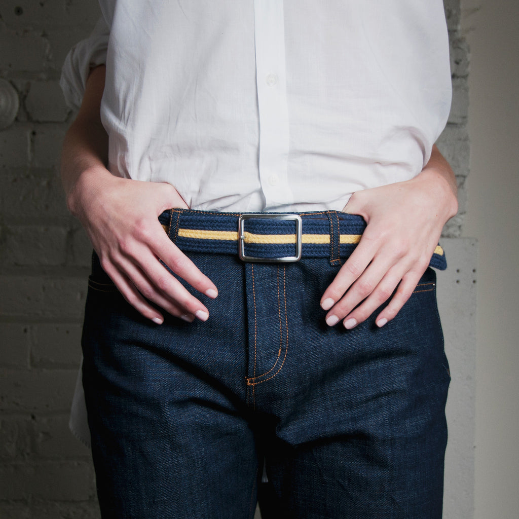 These belts are soft, yes, but they're sturdy too, because they are made from eight separate strands of cashmere rope stitched together with thread made from mercerized Egyptian cotton. Our belts come in four sizes, and one of these sizes is guaranteed to fit you perfectly — just stab the buckle's prong through the meat of the strap wherever it is most appropriate to do so.