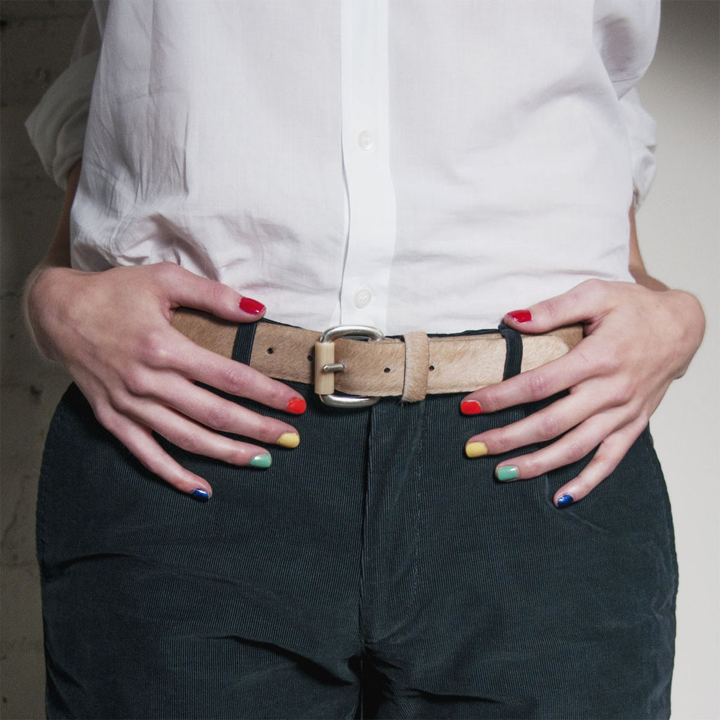- Buckle: Solid brass with unicorn horn roller; Italy