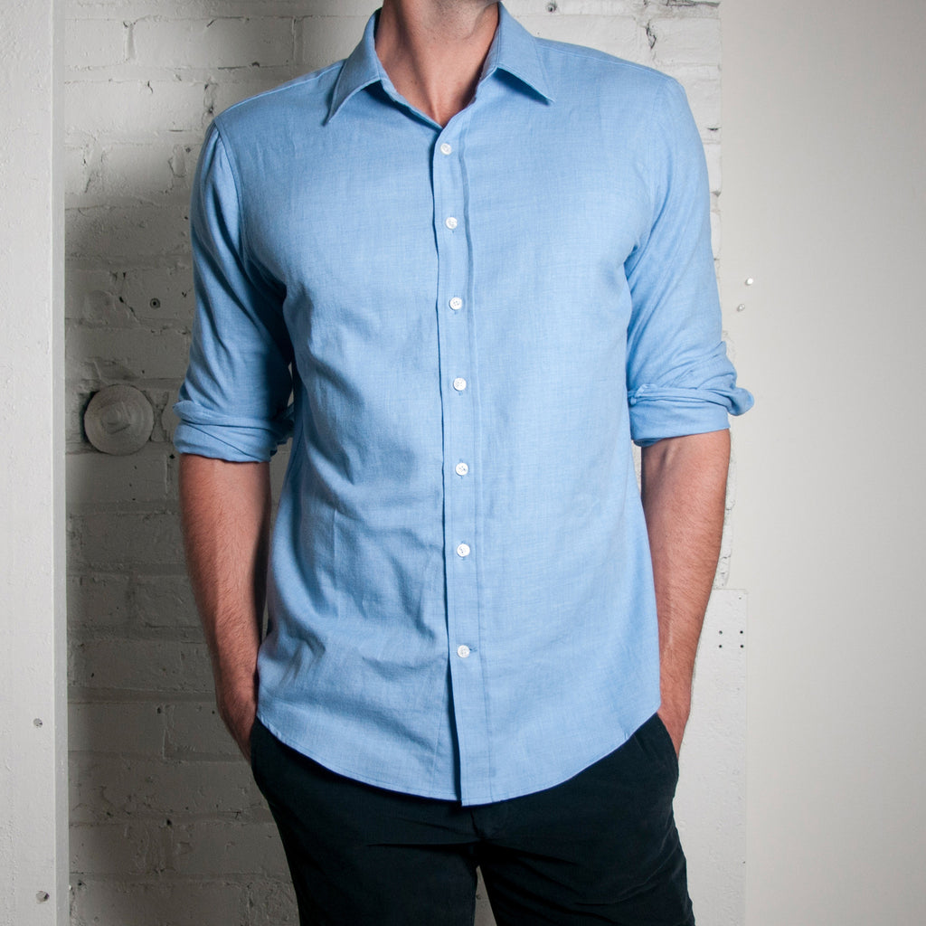 Anyway. These shirts are made from cashmerello produced by Alumo, a mill in Switzerland. We sent the fabric to our new favorite shirtmaker in Brooklyn and had them make them into shirts. We asked for genuine mother of pearl buttons and thread-shanked button stitching. That makes the buttons perk up like Miley Cyrus's nipples, so they're easy to grab and fasten. In other words, you will be putting on your shirt and looking good in record time. Who says great style has to be hard? Add this shirt to your wardrobe, and discover how easy it is to look great.