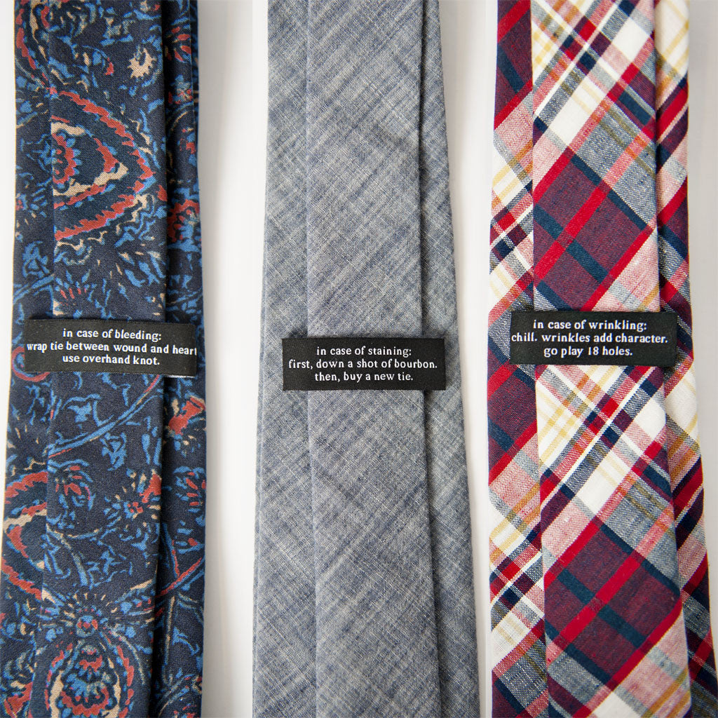 When we saw these fabrics for sale at The Hillside a while back, we knew we could turn them into beautiful neckwear. Perfectly proportioned. Hand-stitched in New York, with our signature orange bar tacks and Italian wool interlining. But what could we do to make them even more magnificent? Well, we thought, not enough menswear incorporates poetry, and these fabrics were all made in Japan. So what if we invented a new art form called tieku and included an original poem on each keeper?