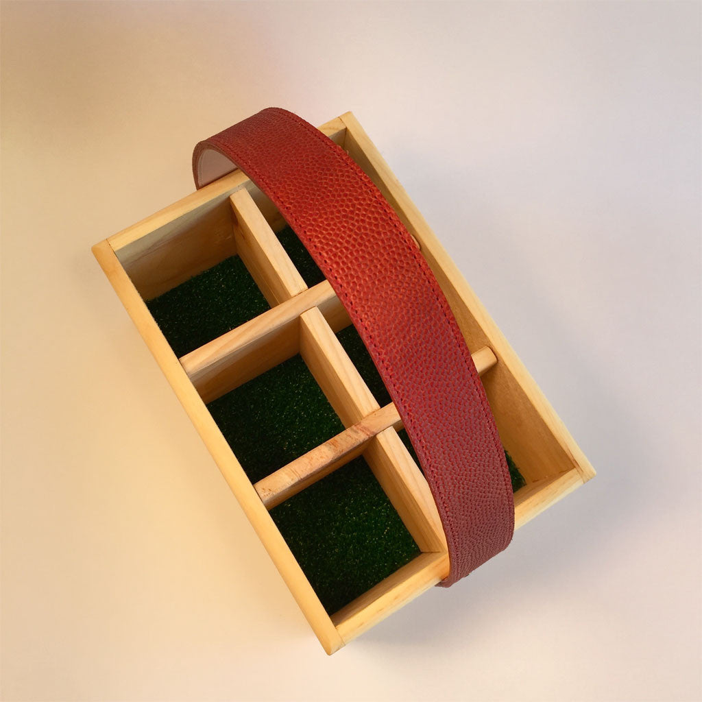 Even in inclement conditions, our box's strap, made from Horween Tanned in Tack leather, aka the stuff they make NFL footballs out of, will help you keep a sure hand on your supply of beverages. Those beverages will be resting safely on a playing field made out of genuine AstroTurf 12, the world's first artificial turf. Not the most forgiving stuff for an aging running back's knees, but your beer bottles will never feel more pampered.