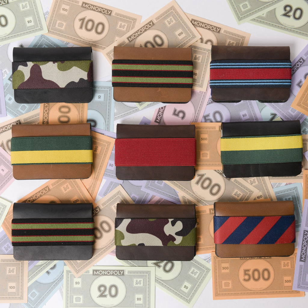 The elastic comes from Italy. The brass comes from a tuba we won in a poker game from a guy named Takehiko who was a mediocre musician and an even worse bluffer. Subsequently, we took three tuba lessons and felt like we were making out with a plumbing system — it was not for us. That's when we decided what we'd really won from Takehiko was the opportunity to develop a streamlined but genuinely useful wallet. Now here we are.